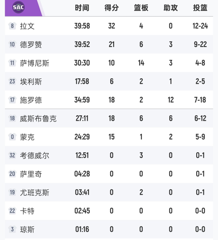 而反观国王这边则是兵强马壮,他们并没有遭受到任何伤病潮,球队核心拉文的表现也越来越好,在新赛季和湖人一样都取得了1胜1负战绩。今天球队沿用了之前的先发阵容, 拉文、德罗赞、萨博尼斯三大核心悉数出战,埃利斯和施罗德继续携手后场。而球队新赛季强援维斯布鲁克也将替补出战,这是他首次以国王球员身份对阵老东家湖人,威少能否打出耀眼表现也是今天的一大看点之一。
