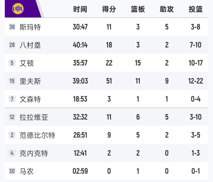 下半场里弗斯突然爆发,他在第三节单节轰下15分3篮板3助攻,率领球队打出33-28攻击波,一举建立领先优势,末节湖人顶住压力,里弗斯再轰15分帮助球队锁定胜利。全场战罢,湖人以127-120击败开拓者。里弗斯单核带队完全证明自己,怒轰51分11篮板9助攻2抢断;艾顿则不遑多让,拿到22分15篮板2助攻1抢断1盖帽的两双数据。湖人在伤兵满营情况下依然涉险过关,看来没有东契奇和詹姆斯球队也能行。